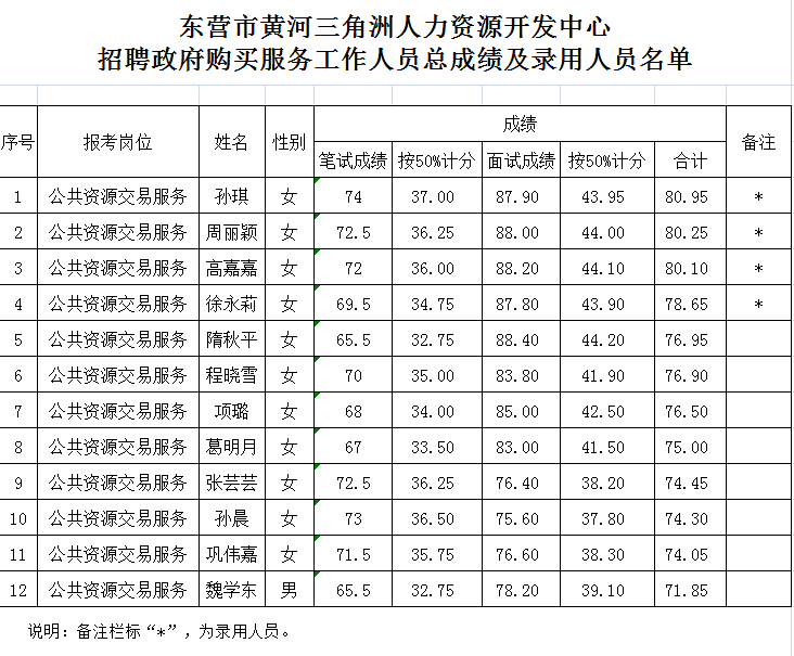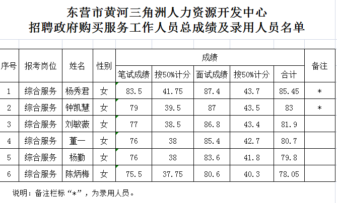 關(guān)于公布東營(yíng)市黃河三角洲人力資源開(kāi)發(fā)中心招聘政府購(gòu)買服務(wù)工作人員總成績(jī)及錄用人員的通知