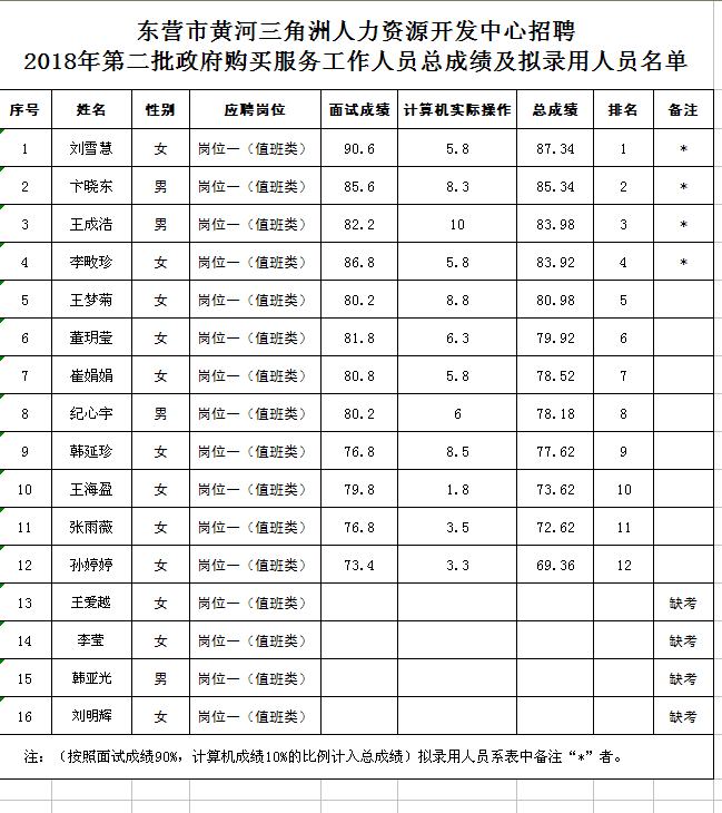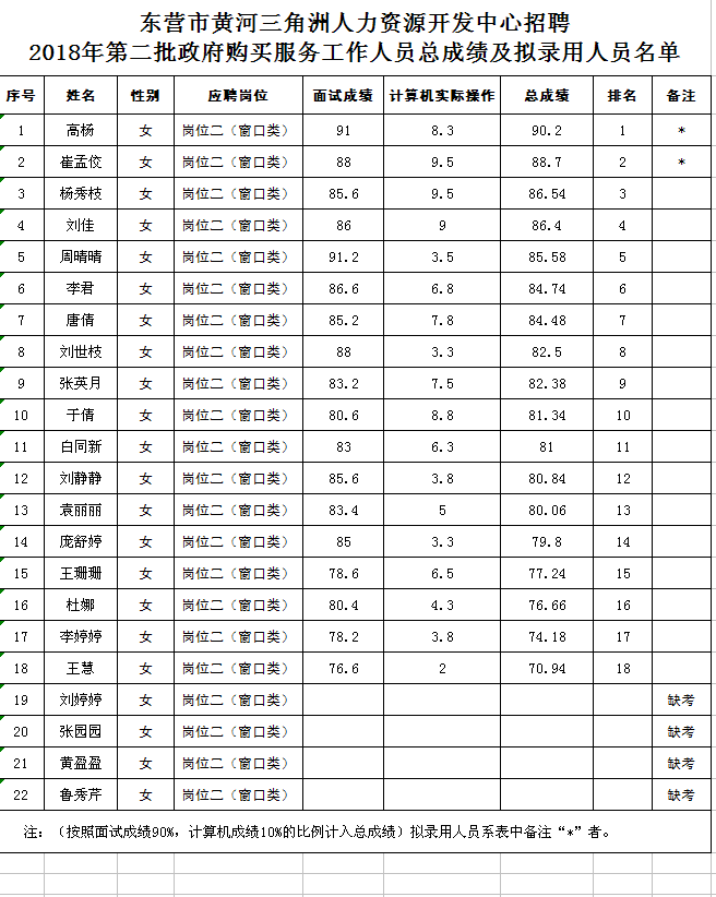 關(guān)于公布東營(yíng)市黃河三角洲人力資源開(kāi)發(fā)中心招聘2018年第二批政府購(gòu)買(mǎi)服務(wù)工作人員總成績(jī)及擬錄用人員名單的通知