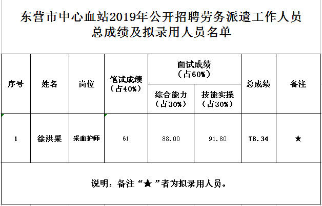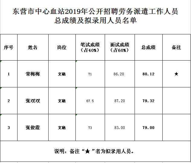 根據(jù)有關(guān)規(guī)定要求和本次招聘活動(dòng)的統(tǒng)一安排,現(xiàn)將《東營(yíng)市中心血站2019年公開招聘勞務(wù)派遣工作人員總成績(jī)及擬錄用人員名單》予以公布,請(qǐng)查閱。